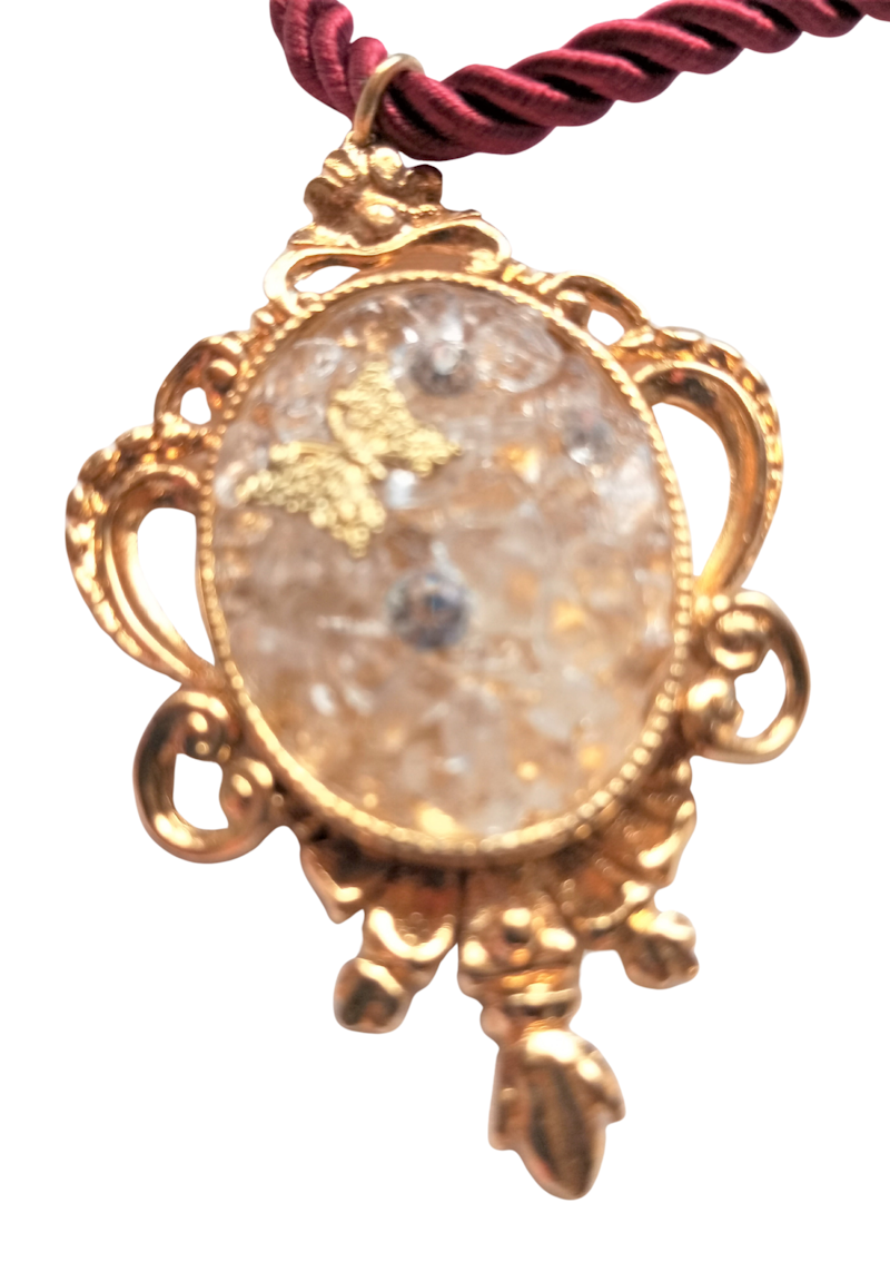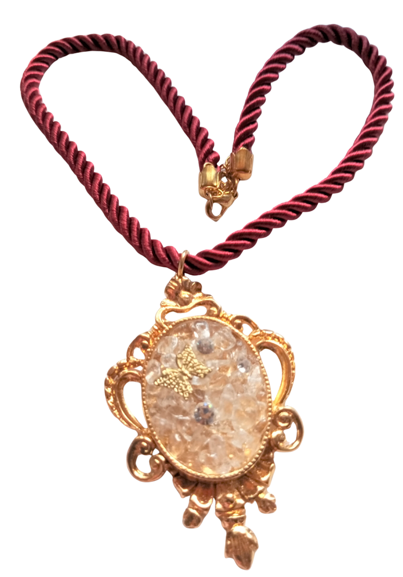 Erfreuen Sie sich an diesem luxuriösen Anhänger mit funkelndem Bergkristall und eingebettet in glänzende Strasssteinchen und einen kleinen Schmetterling. Das gedrehte Stoffband verleiht elegante Extravaganz. Handgefertigt in meiner Werkstatt, ist dieses Schmuckstück ein Ausdruck individueller Schönheit und Stils.