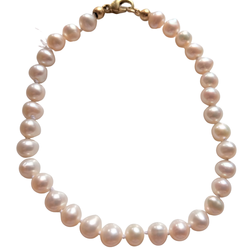 Perlenarmband mit weissen Süsswasserperlen. Einzeln geknotet. Das Armband hat eine Länge von ca. 20 cm. Die Perlen sind 5-6 mm gross und haben einen tollen Lüster.