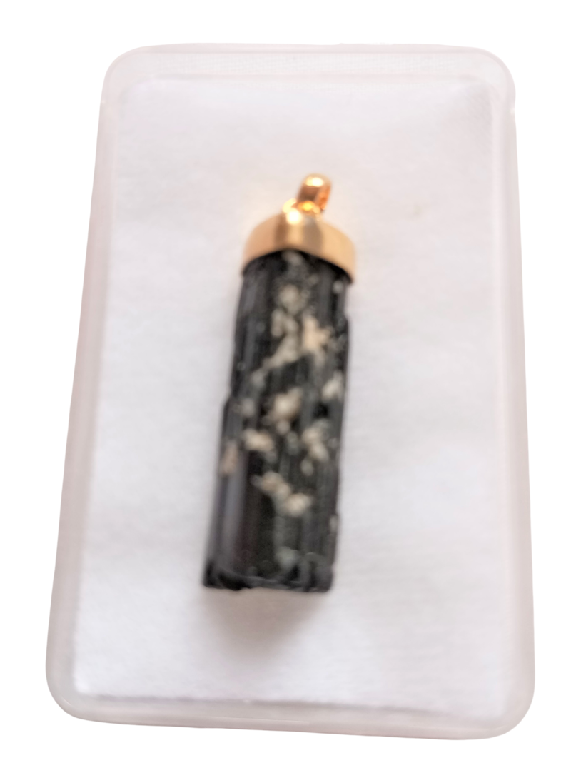 Der Edelsteinanhänger schwarzer Turmalin mit goldfarbener Öse ist ein attraktiver Schmuck, der Eleganz und Stil miteinander verbindet. Der Tiefe, mystische Farbton des Turmalins kontrastiert wunderbar mit der warmen Goldfarbe der Öse. Ideal für jedes Outfit oder Anlass. Ein zeitloses Geschenk für jeden Edelsteinliebhaber.