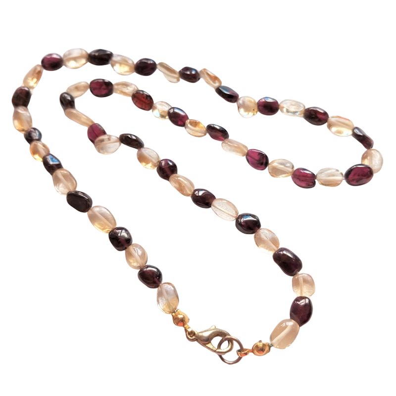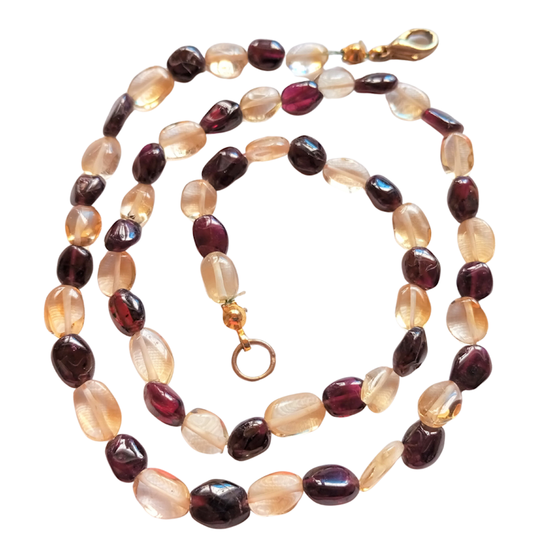 Erleben Sie pure Eleganz mit der handgefertigten Edelsteinkette aus Granat und Citrinoliven! Diese 44cm lange Einzelstück-Kreation strahlt Individualität und feine Handwerkskunst aus. Entworfen & gefertigt in eigener Werkstatt - ein atemberaubender Hingucker, der jedes Outfit glanzvoll vollendet.